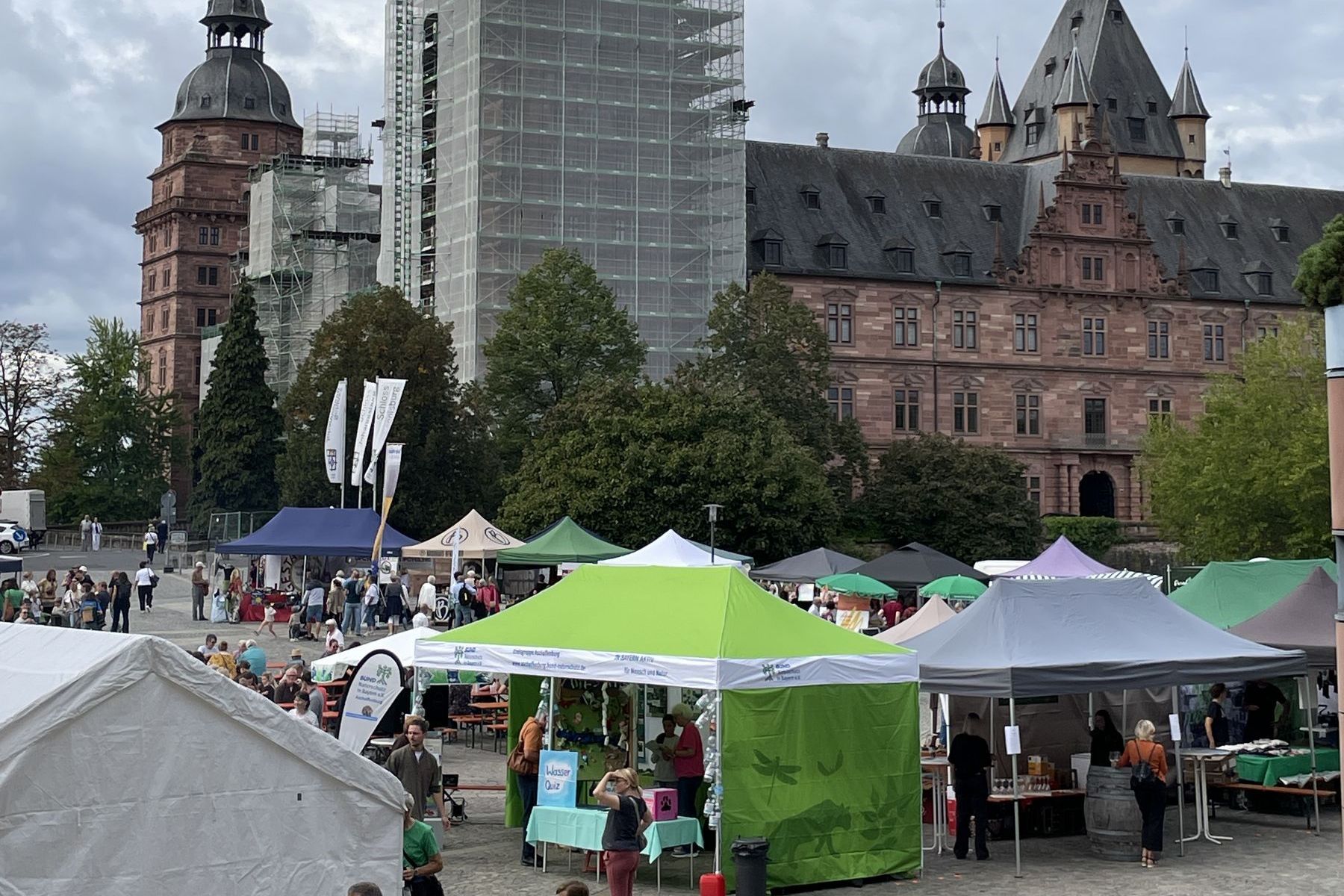 Zahlreiche Besucher erkundeten im vergangenen September das vielfältige Angebot an nachhaltigen und ökologisch wertvollen Produkten auf dem nunmehr 21. Aschaffenburger Ökomarkt: u.a. frische Produkte vom Biohof, Streuobst-Produkte, Naturkosmetik, Unverpackt-Waren, Kleidung aus Naturmaterialien, Filzprodukte, wiederverwendbare haltbare Artikel für den Alltag und technische Lösungen unter Nutzung der Erneuerbaren Energien. Vor herrlicher Schlosskulisse konnte man über den Markt bummeln und beim Seifenmachen zuschauen, Apfelsorten vom Fachmann bestimmen lassen oder die Bienen beim Imkerstand beobachten und noch vieles mehr.